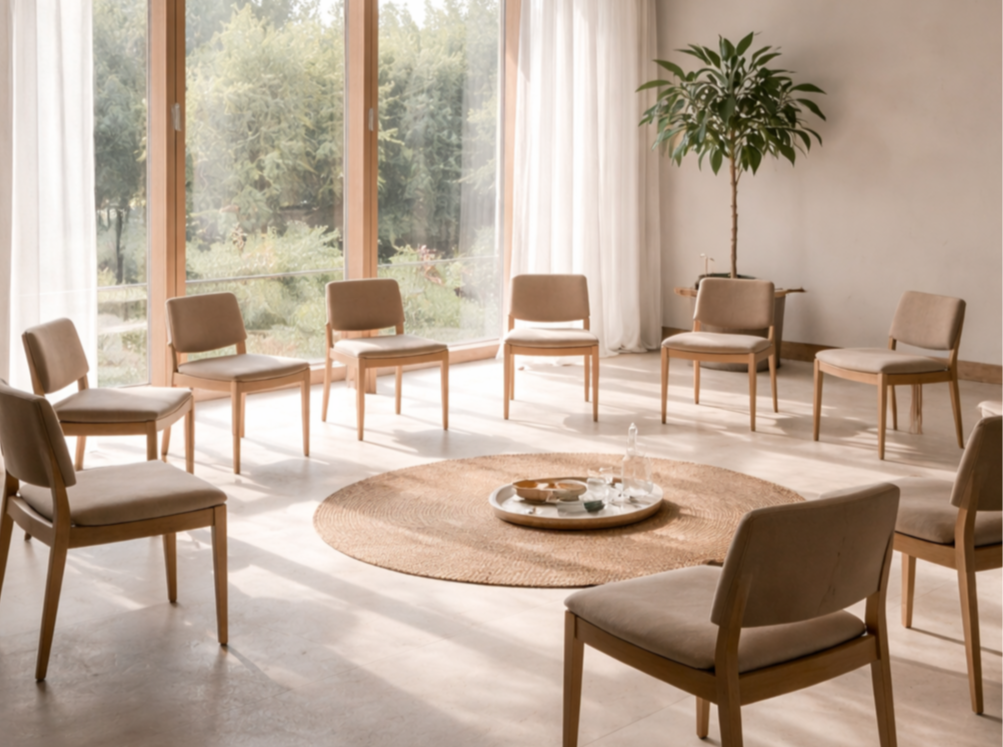 In the meeting room, chairs form an open circle.